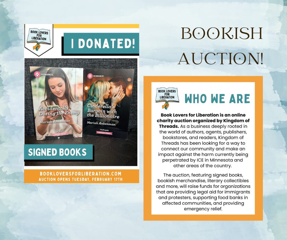 Just popping in real quick to tell y’all that I am participating in the Book Lovers for Liberation auction this week. I donated signed copies of Accidentally Dating The Enemy and Cinderella’s Bargain With The Billionaire.